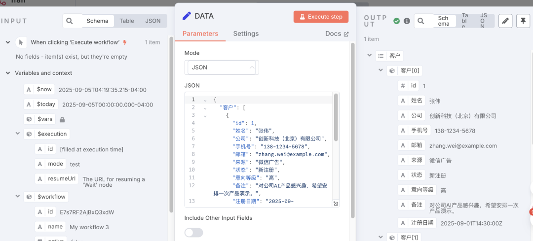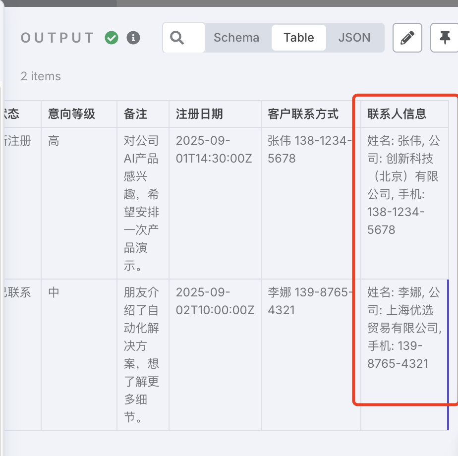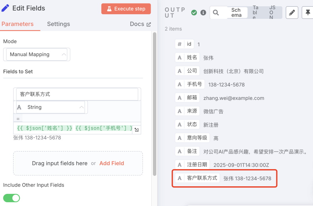 根据我们之前使用的中文 JSON 数据,我们可以创建一个 Code 节点来生成一个包含完整联系人信息的字段,例如,将 姓名、手机号 和 公司 组合成一个便于查看的字符串。