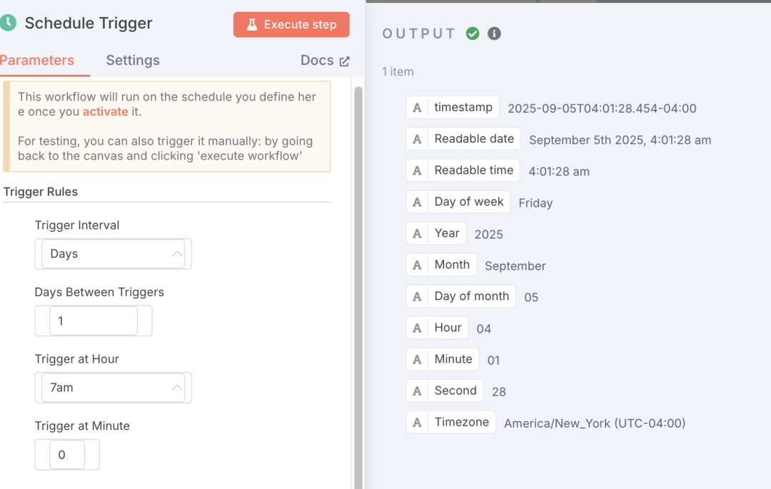 测试流程时会频繁用到。 - 定时触发器(Schedule Trigger / Cron)