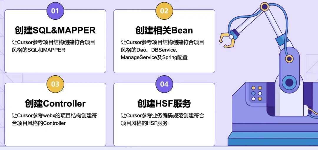 接下来展示通过Cursor在老项目中创建SQL&Mapper、相关Bean(DO、Dao、DBService、ManageService)、Controller、HSF服务的高效过程。
