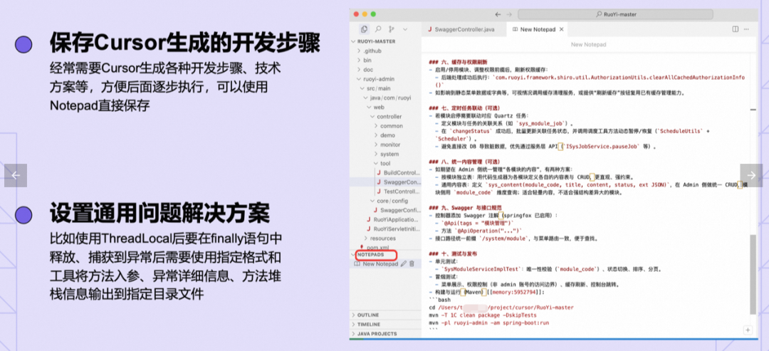 一些通用方案(比如要求使用springboot、mysql等)还可以沉淀到Notepad或者Rules中,这样Cursor以后生成的方案中就会默认包含该部分规则。