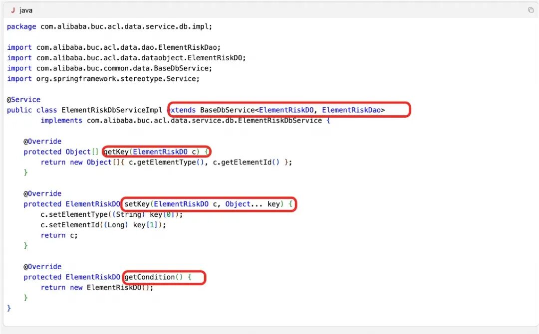 生成的DBService同样继承了所有DBService的父类、泛化类型符合要求,同时还和其他DBService实现类一样复写了getKey、setKey、getCondition几个关键方法,这些都是项目独有的结构,生成的非常好。