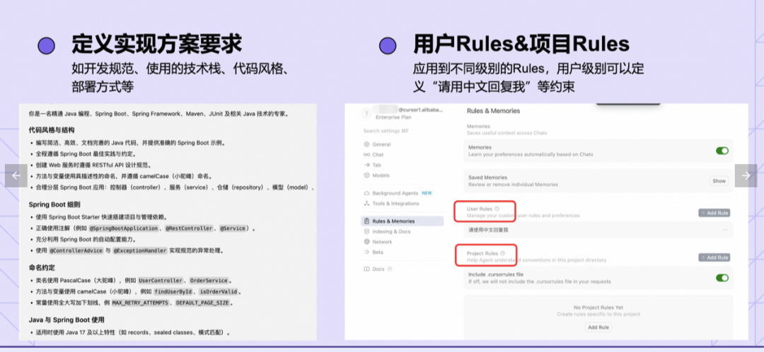 为了让Cursor生成符合我们要求的代码,我们创建一个项目级的Rule,将项目的编码规范加入其中,为了验证Cursor是否真的按约定的规范生成代码,这里我们留意以下几点: