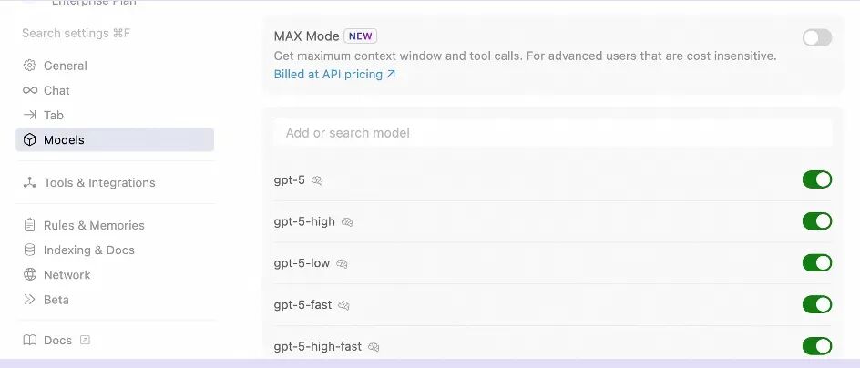 Cursor内置了很多模型,也可以自己配置其他模型,但是自己配置的模型有可能不支持代码的自动创建。
