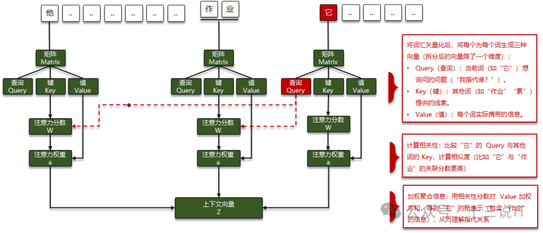 那么问题来了:句中的“它”指代什么?人类会立刻明白“它”指“作业”,但模型需要通过自注意力的学习才能理解这种关联。
