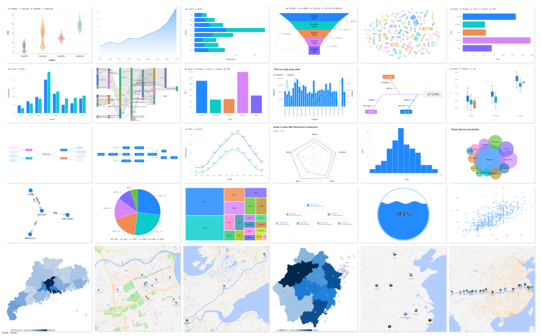 - • ECharts:百度开源,后贡献给 Apache,生态丰富