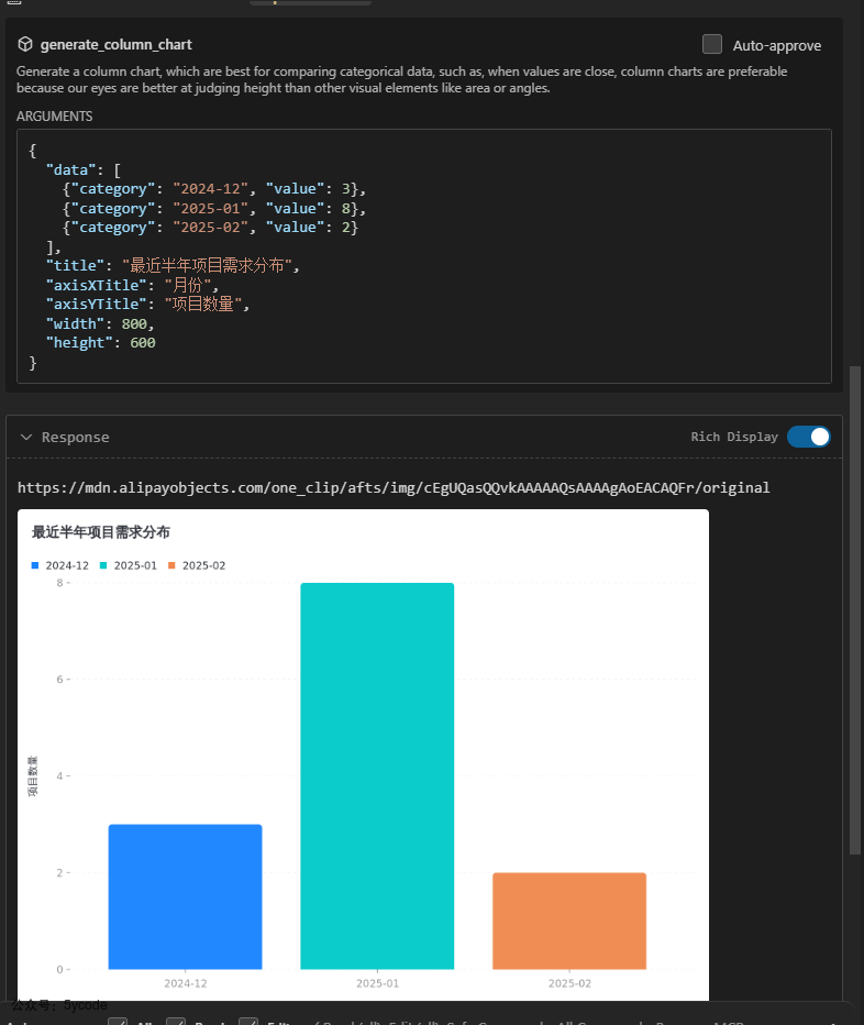 MCP Server Chart 默认提供免费的图表生成服务,也就是上图中的图片地址。对于需要私有部署的用户,可以尝试使用VIS_REQUEST_SERVER来自定义自己的图表生成服务。
