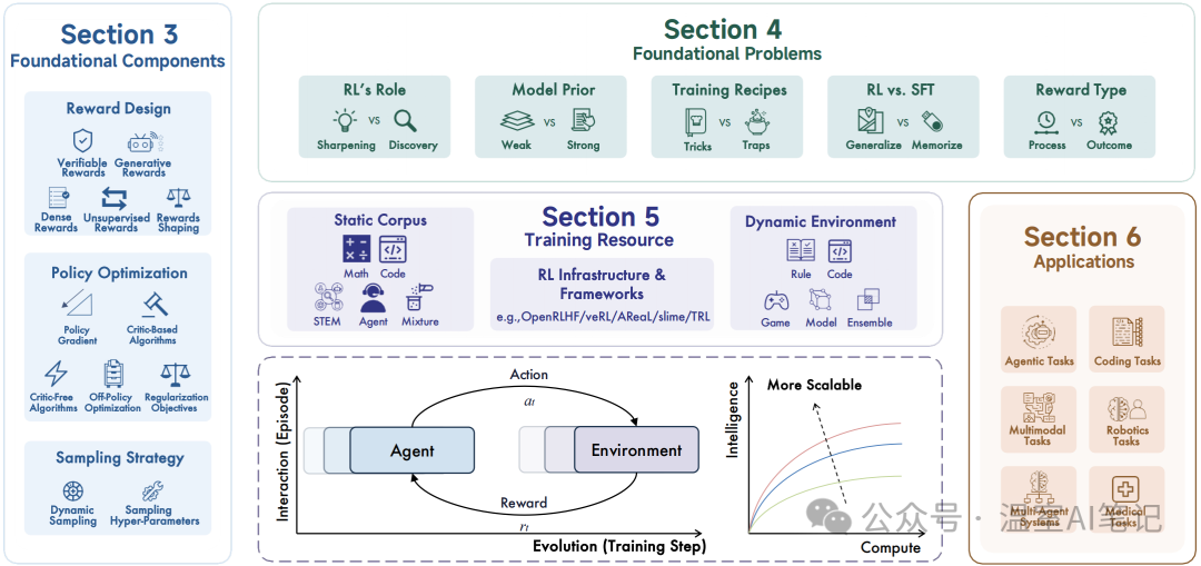 在技术层面,综述详细拆解了RL训练流程的三大基础组件:奖励设计(如可验证奖励、生成式奖励、稠密奖励等)、策略优化(涵盖基于评论家和无评论家的算法)以及采样策略。