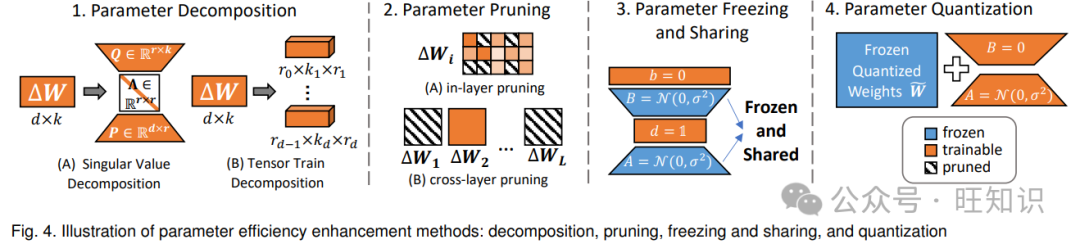 - 运用多种技术实现参数效率增强,如参数分解、剪枝、冻结与共享、量化等,并通过不同方法优化秩适应。