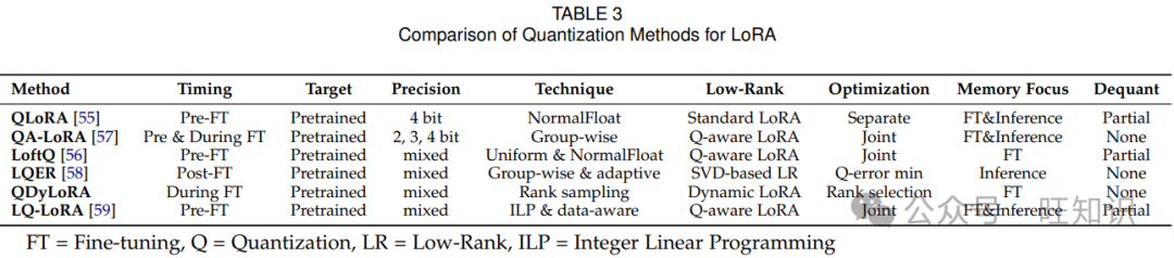 总之,预微调量化方法(如 QLoRA 和 LoftQ)通常通过冻结预训练权重提供更大的内存节省,而后微调方法(如 LQER)则更侧重于优化推理精度。在量化技术方面,非均匀和混合精度方法(如 QLoRA、LoftQ 和 LQ - LoRA 中所见)在低比特场景下表现出优越的性能,能够根据权重分布提供更灵活的精度分配。量化的时机和具体的量化技术在决定内存效率和模型性能之间的平衡方面都起着关键作用。表 3 提供了所讨论的量化方法的全面总结。