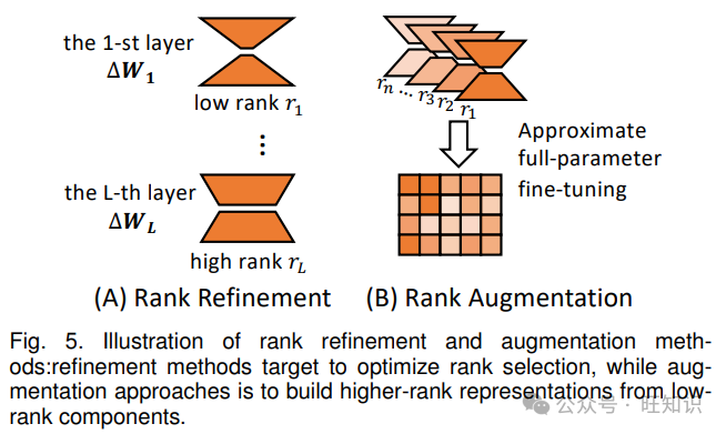 秩是 LoRA 中的一个关键参数,直接影响模型的适应性和可训练参数的数量。原始的 LoRA 方法在所有层中采用固定的低秩,这对于不同的下游任务和模型架构可能不是最优的。为了解决这些限制,最近的工作提出了各种方法来优化 LoRA 中的秩分配,大致可分为两个主要方面:秩细化和秩扩充。图 5 展示了这两种方法的示意图。