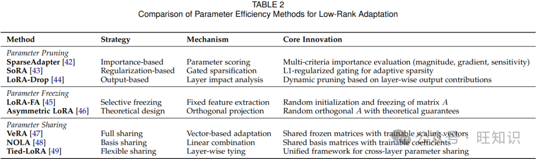 结合参数剪枝技术(第 3.1.2 节),这些方法能够在保持适应有效性的同时显著减少参数数量。表 2 提供了这些方法的全面比较。