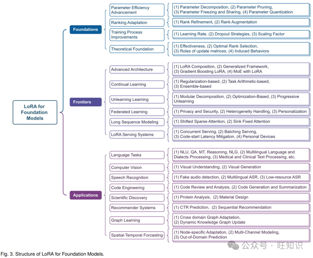 本综述组织了现有的 LoRA 研究,如图 3 所示,确定了第 6 节中的关键挑战和未来研究方向,为该领域的研究人员和从业者提供了宝贵资源。