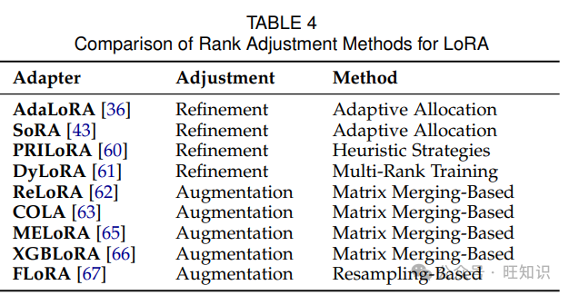 总之,秩适应策略通过根据不同层和任务的要求定制适应矩阵的秩来增强 LoRA 的适应性。表 4 提供了关于秩细化和扩充的详细总结。