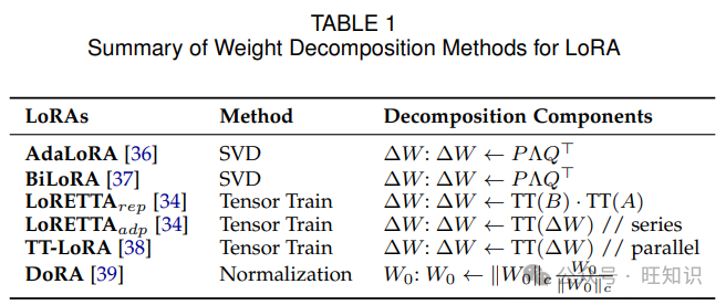 这两种方法在参数效率和微调灵活性方面都具有独特的优势。更新矩阵分解方法侧重于分解微调期间应用的增量更新,而预训练权重分解直接修改原始模型权重的结构,表 1 提供了这些方法的详细比较。