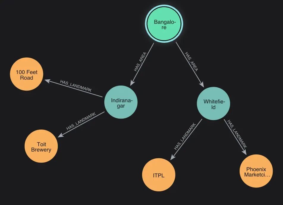 举个例子,班加罗尔(Bangalore)是印度的一个城市,包含两个区域:Indiranagar 和 Whitefield。Indiranagar 有 Toit Brewery 和 100 Feet Road 这样的地标,而 Whitefield 有 ITPL 和 Phoenix Marketcity。这些关系可以在图谱中这样表达: