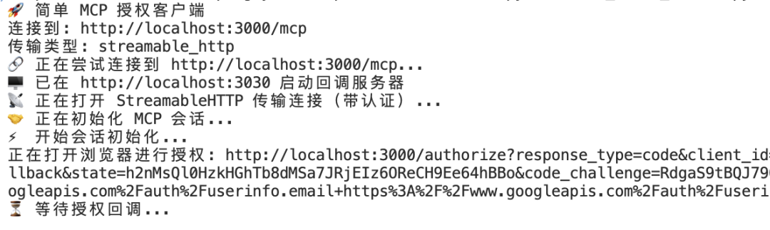 输入你的Google帐号和密码,让MCP Server借助你的Google授权来对MCP客户端进行认证,并允许后续的资源访问。如果你的帐号密码正确,很快你会看到: