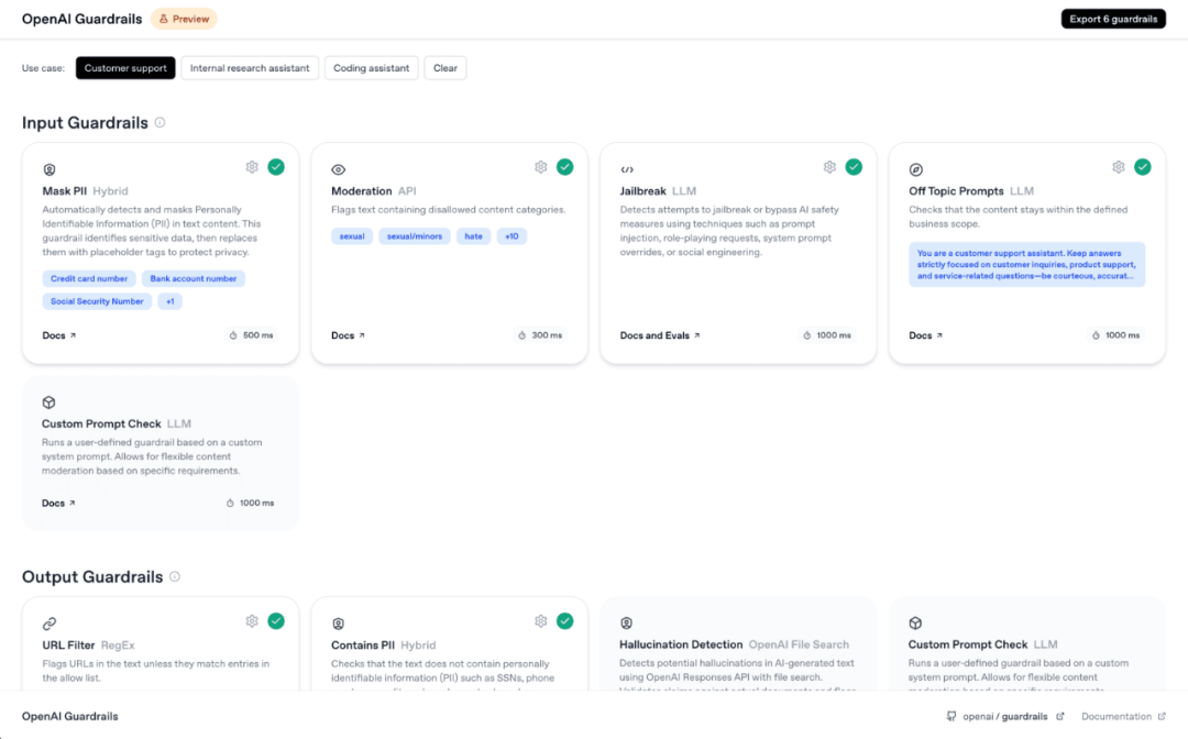 官方 Guardrails[9] 作为开源、模块化安全层,支持 PII 屏蔽/标注、越狱检测与策略化约束,可在 Builder 里开关,也可通过 Python/JS 库独立集成,形成“开发-测试-上线”同一套安全基线。