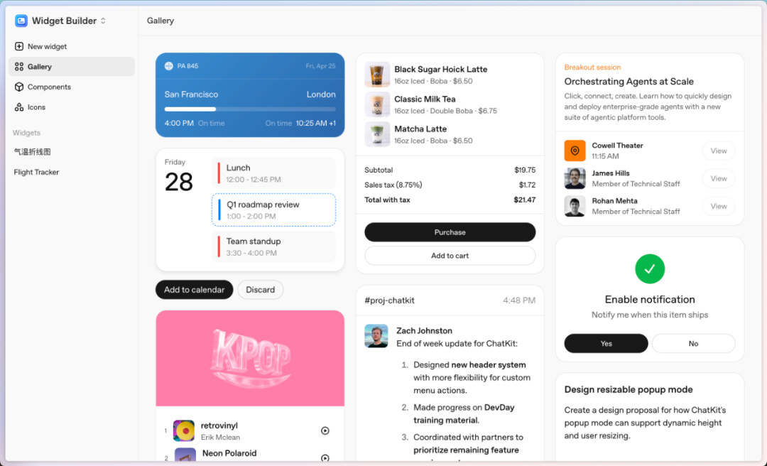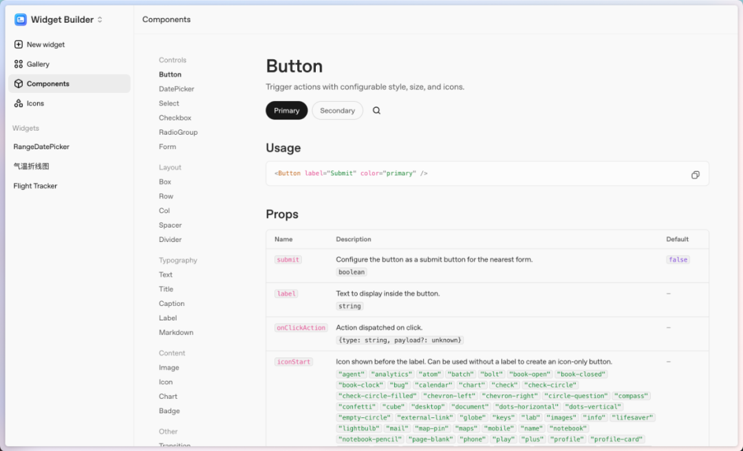 画廊则展示了一些小部件,组件、图标就是标准的组件库内容,多一句嘴,咋感觉 OpenAI 把 shadcn[16] 又包了一层壳。