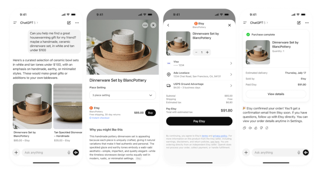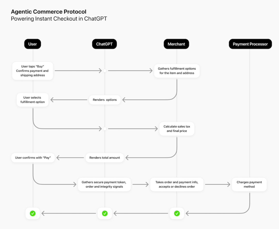 通过 Instant Checkout 功能,用户可以在对话中直接完成下单购买。该功能基于 Agentic Commerce Protocol (ACP)[3] —— 由 OpenAI 与 Stripe 联合开发的开放标准 —— 为商家和开发者提供了一个简单高效的方式,将对话流量转化为实际销售。