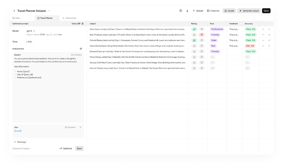 新版 Evals 引入四大能力:Datasets、Trace Grading、Automated Prompt Optimization、第三方模型支持。它把“人标 + 自动评分 + 自动改写”串成闭环,并能在端到端执行轨迹上定位短板,显著提升生产级可验证性与回归效率。