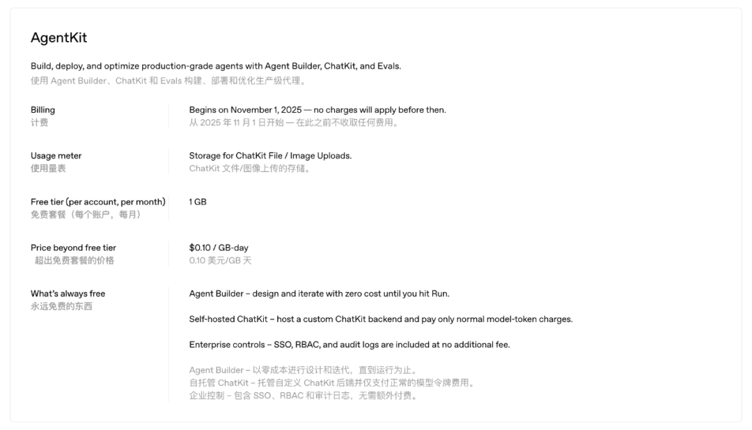 ChatKit 与新 Evals 已普遍可用;Agent Builder 处于 Beta;Connector Registry 正面向具备 Global Admin Console 的 API/Enterprise/Edu 客户分批 Beta。与标准 API 模型定价打包;此外,ChatKit 文件/图片存储的计费自 2025-11-01 起生效,之前不收取此项费用(有免费额度与日计费说明)。