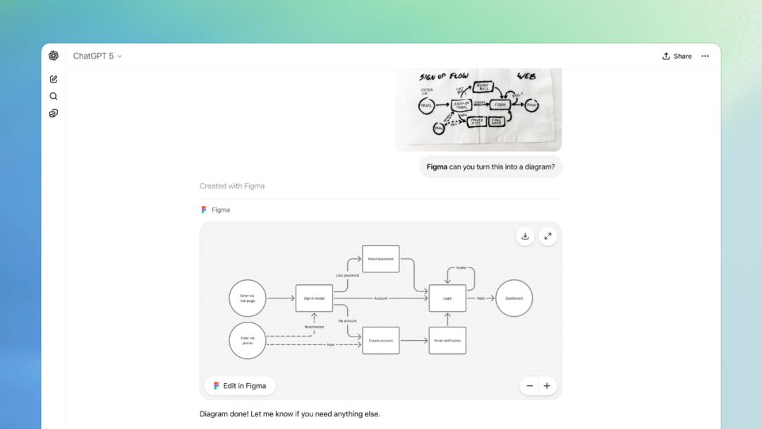 用户可通过自然语言调用应用(如 “Spotify,帮我生成一份派对歌单”),或由 ChatGPT 在对话中智能推荐相关应用(如讨论买房时出现 Zillow 房产搜索界面)。这些应用融合了地图、播放列表、演示文稿等交互元素,实现“聊天即操作”的全新体验——比如让 Canva 直接把你的提纲转为幻灯片,或在观看 Coursera 课程时实时提问。我尝试用 Figma 生成 UI 图失败了,貌似现在只能生成流程图(感觉有点鸡肋)。