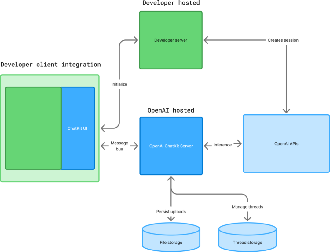 要在前端嵌入 ChatKit,需创建一个代理工作流,托管在 OpenAI 服务器上,然后设置 ChatKit 并添加功能。核心架构图如下: