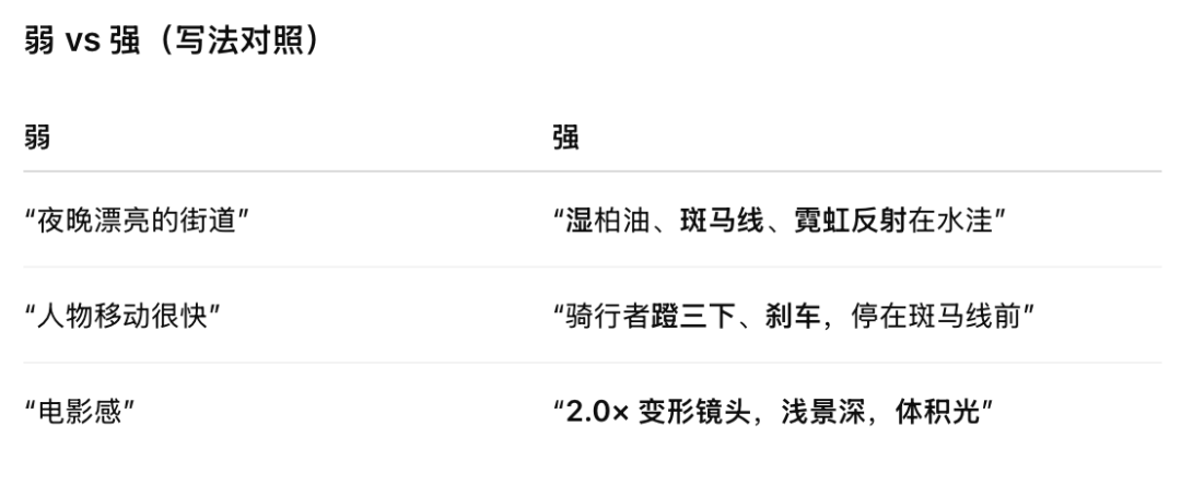 - 清晰的镜头语言(机位/景深/动作节拍/光源与色盘锚点)= 更一致结果。