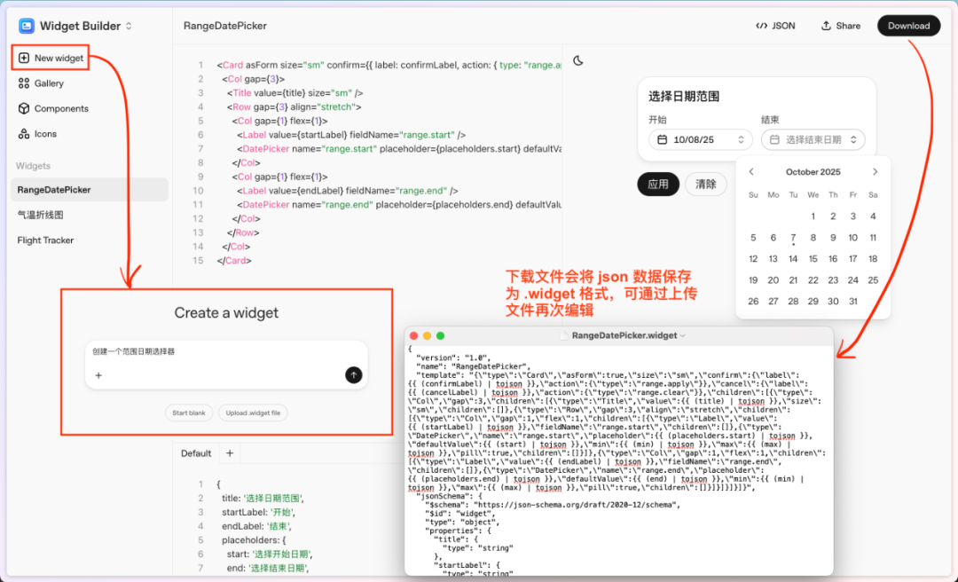 这部分也很有意思,它让组件开发成本进一步降低,通过 AI 对话,直接生成组件,也支持 .widget 文件上传(会添加到侧栏 Widgets 下)。