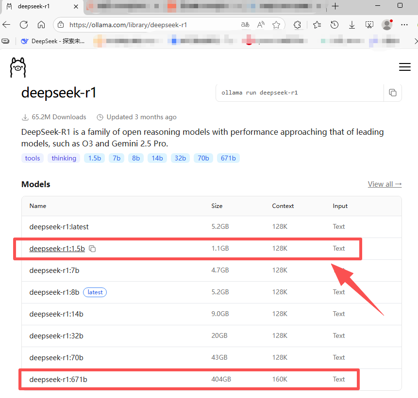 选择适合自己的版本 https://ollama.com/library/deepseek-r1