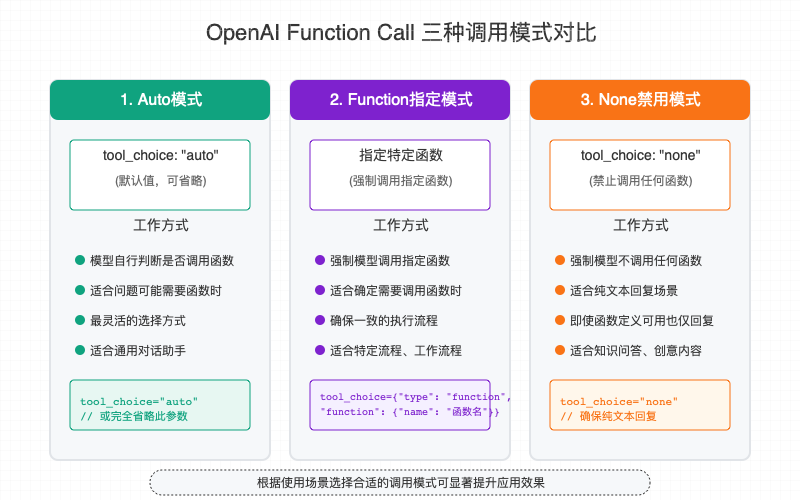 - auto 自动模式(默认):模型会根据用户的输入内容自行判断是否需要调用函数。这是最灵活的设置方式,适合通用型助手应用。