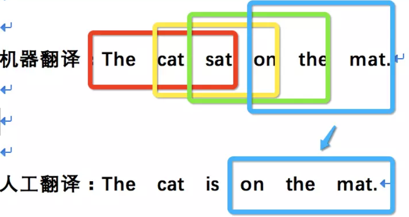它计算生成译文中有多少词组(n-gram)出现在标准译文中,并通过一个惩罚因子控制“过短译文”的情况。