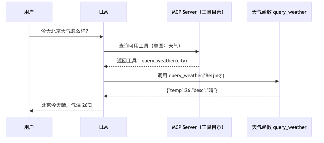 拿 “查北京今天天气” 举例,整个交互流程用时序图展示更清晰,共 5 个关键步骤: