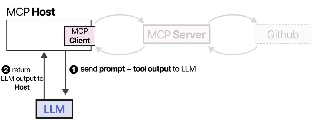 - 最后,MCP Host 将工具执行结果输入到 LLM。LLM 返回最终的响应结果给用户。