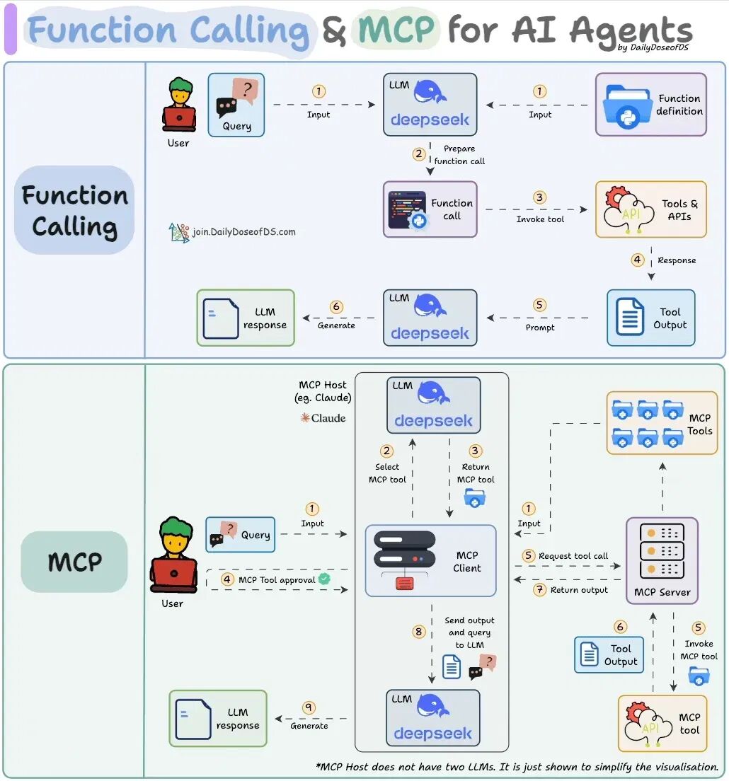 MCP 与 Function Calling 的处理流程的区别: