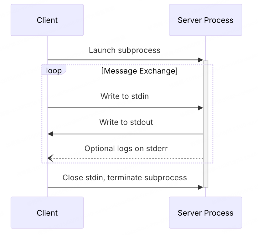 Stdio 适用于本地集成,特别适合同一机器上的通信。Client 和 Server 通过 OS/Kernel 的 stdin、stdout、stderr 管道进行数据传输。