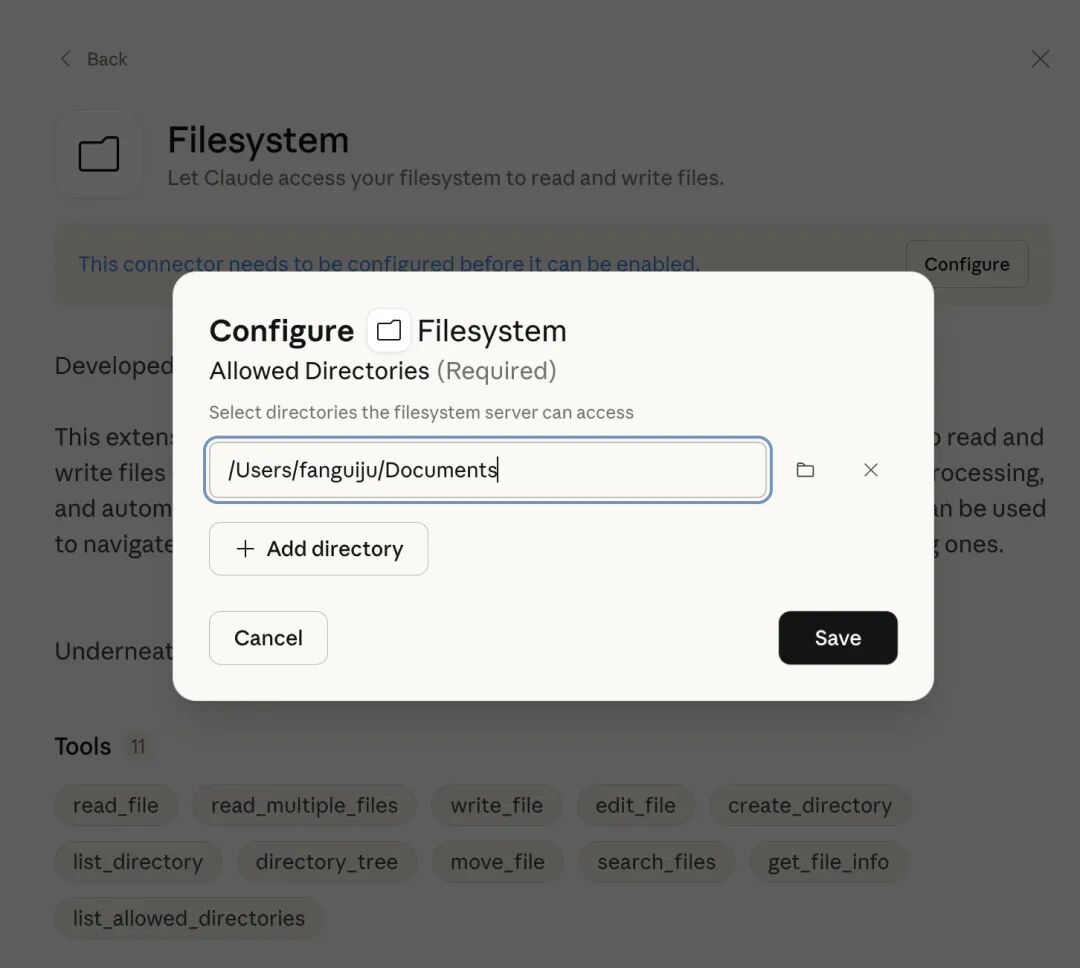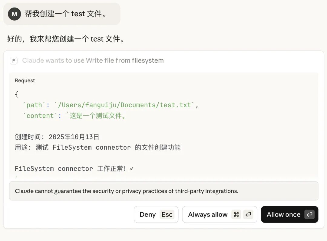 在使用过程中,FileSystem MCP Server 会访问 MacOS 的文件系统,并且在执行 Tools 的时候它始终会要求人工确认。这符合 MCP 安全设计理念。
