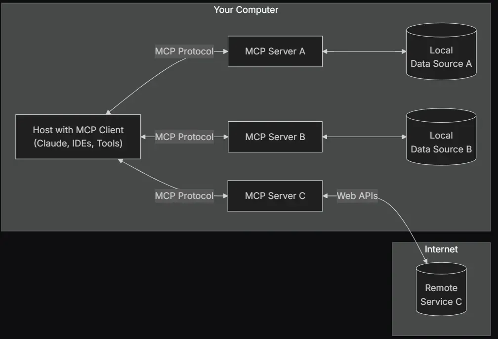 - Remote Resources:运行在 Internet 外部环境,MCP Server 通过 Web APIs 进行安全访问的远程服务,例如:云存储、远程 API、在线服务等。