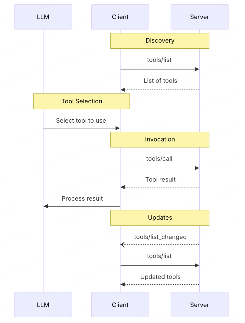 - 然后 MCP Host 将这些 Tools 输入到 LLM。LLM 接收到这些信息后,会选择使用某个工具。然后 MCP Host 再向 MCP Server 发送具体某个工具的使用请求,并收到工具执行结果。