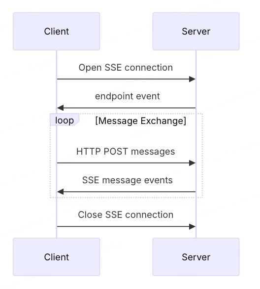 Client 和 Server 交互时,首先通过 SSE Endpoint 完成连接的建立,然后 Server 向 Client 推送一个 HTTP Endpoint,最后 Client 通过 HTTP Endpoint 向 Server 发送请求。