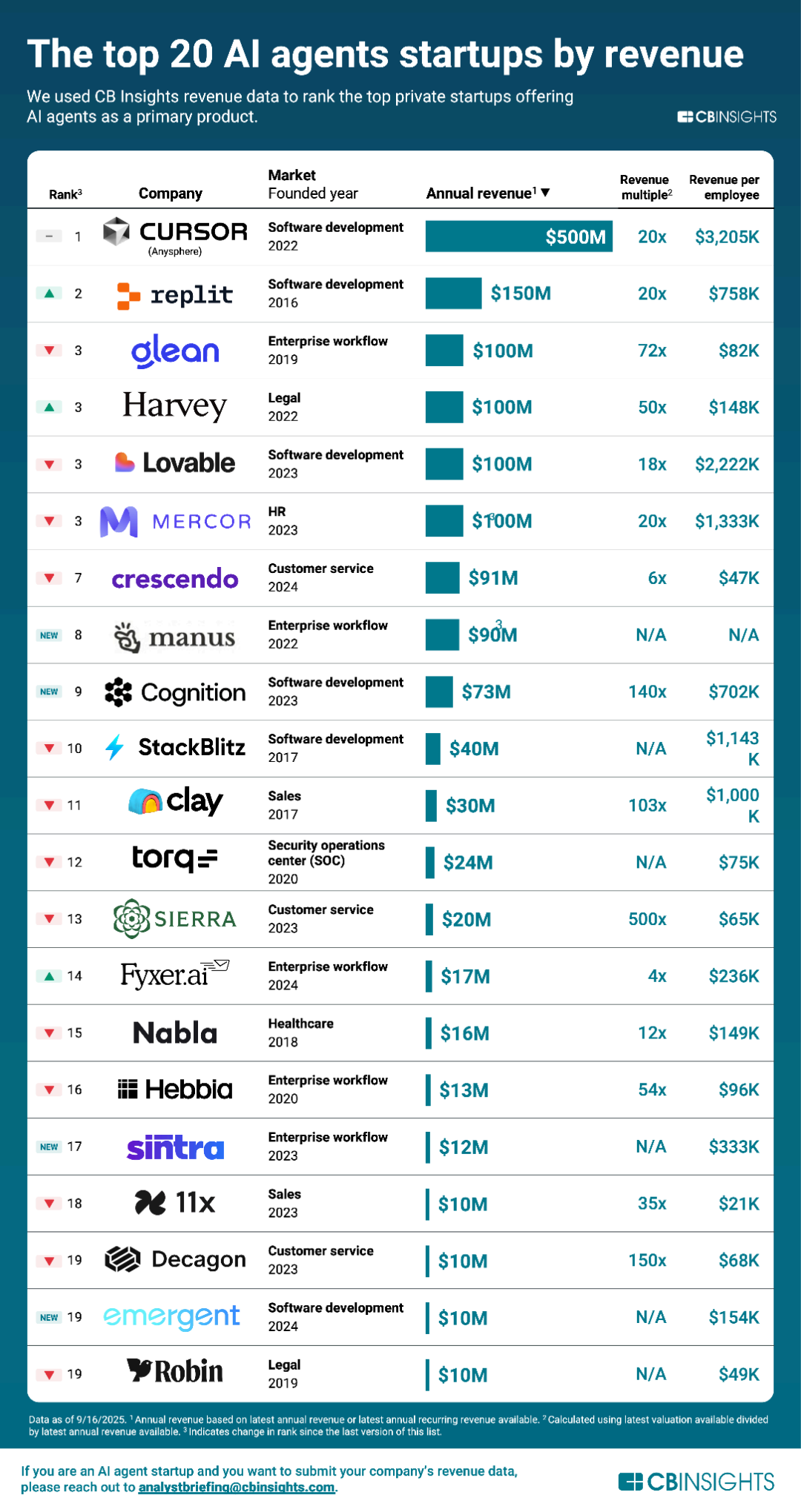 软件开发类 Agent 继续在营收榜单中占据主导地位,共有 6 家上榜企业,其中包括领先者 Anysphere 的 Cursor(年经常性收入 ARR 5 亿美元) 与 Replit(ARR 1.5 亿美元)。