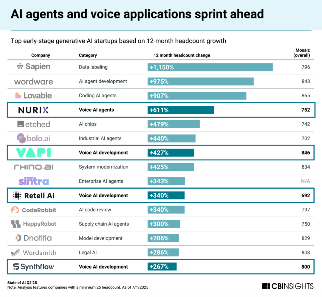 在众多初创公司中,员工增长最快的一批正集中于 AI Agent 相关应用,尤其是在语音 AI 领域。