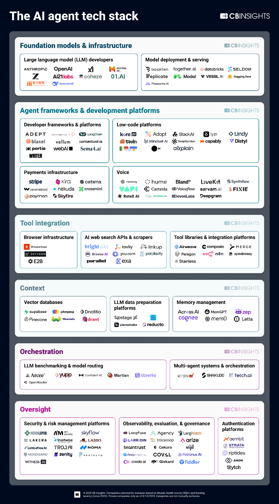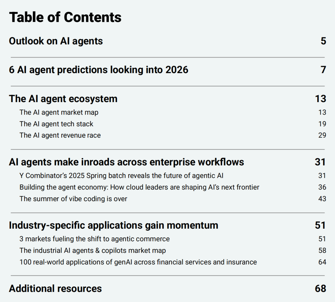 基于如此现状,CBINSIGHTS 最近做了一份《AI Agent Bible》的报告,系统梳理了 AI Agent 的发展前景与未来趋势,提出了面向 2026 年的六大关键预测,并绘制出完整的生态版图,涵盖最值得关注的创业公司、基础设施提供商及快速崛起的营收增长型企业。同时,报告深入解析了市场格局与技术栈的演进,包括 AI Agent 的市场图谱、技术堆栈与收入竞争态势,并通过企业级应用的视角,展示了智能体在大规模环境下如何重塑代码生产、客户服务与后台运营的方式。