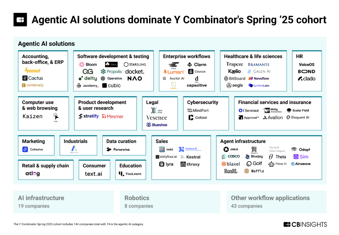 网页浏览类 Agent 从通用工具走向垂直专业化:Y Combinator 已投资了现有网页浏览 Agent 市场中超过****50% 的公司。这些初创企业正从通用型浏览助手转向更具针对性的应用场景,如 遗留系统集成、软件测试与质量保障。