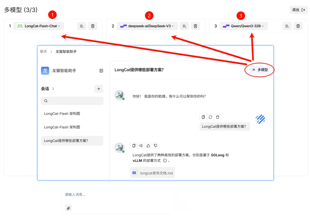 在聊天助手的右上方,点击“多模型”,就进入多个模型同时问答的界面。自行选择模型和参数,进行问答。