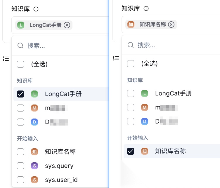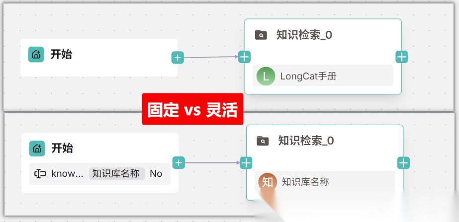 ✅功能描述:支持勾选固定的知识库,也支持知识库名称 由 变量****动态指定(灵活的)。如图所示