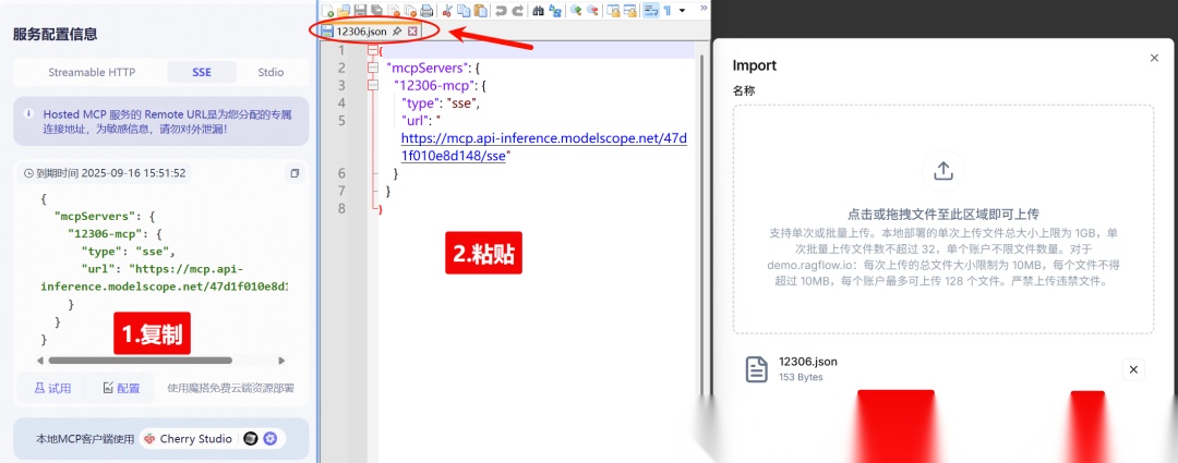 第3个问题,导入MCP 在右上角的设置中,右侧栏点击 MCP 可以看到。
