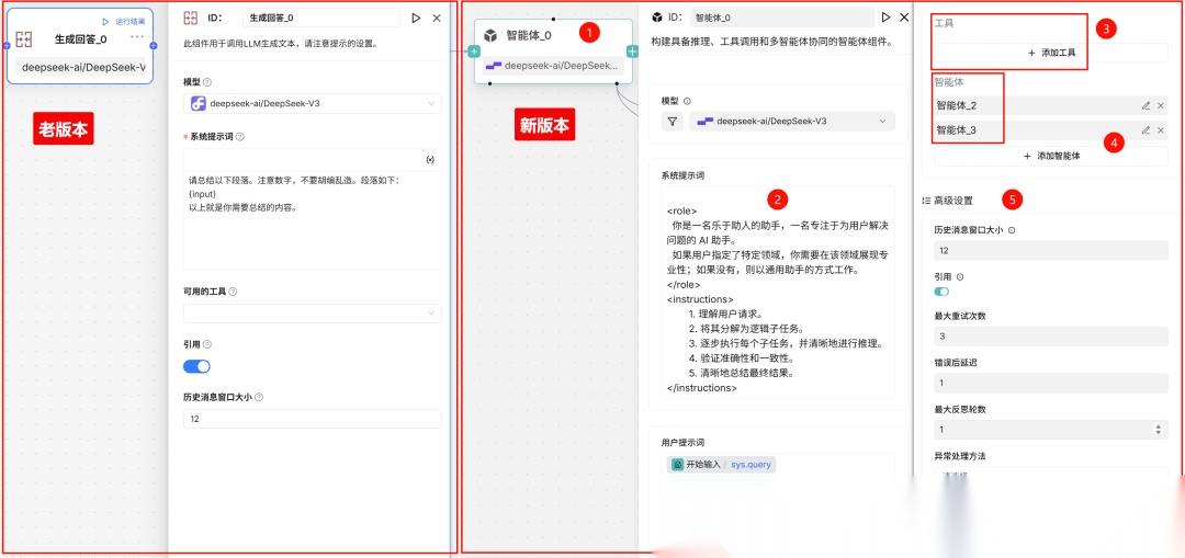 新版本比老版本,更换了样式、修改了提示词、添加了工具(知识库检索/MCP/维基等)、添加了智能体等等