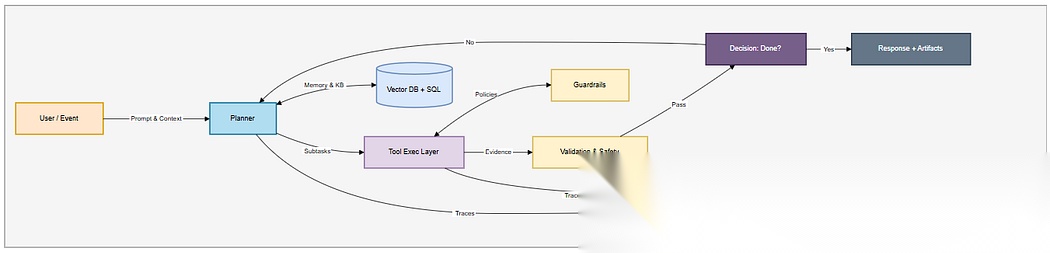 传统机器学习(ML)在输入输出固定时表现优秀。现代企业的共同难题:分类处理支持工单、对账交易、生成合规文档,具有开放性,需要调用多个数据源,且需完善的约束机制。智能体AI架构带来“结构”(规划、状态、策略),以安全且可重复的方式利用大模型(LLMs)。
