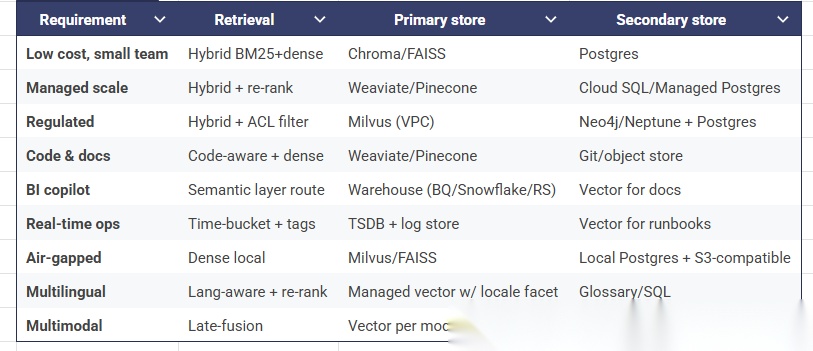 - 优先选择混合检索方式:密集向量嵌入 + 关键词 / BM25 过滤 + 元数据维度(来源、日期、区域、敏感度)。